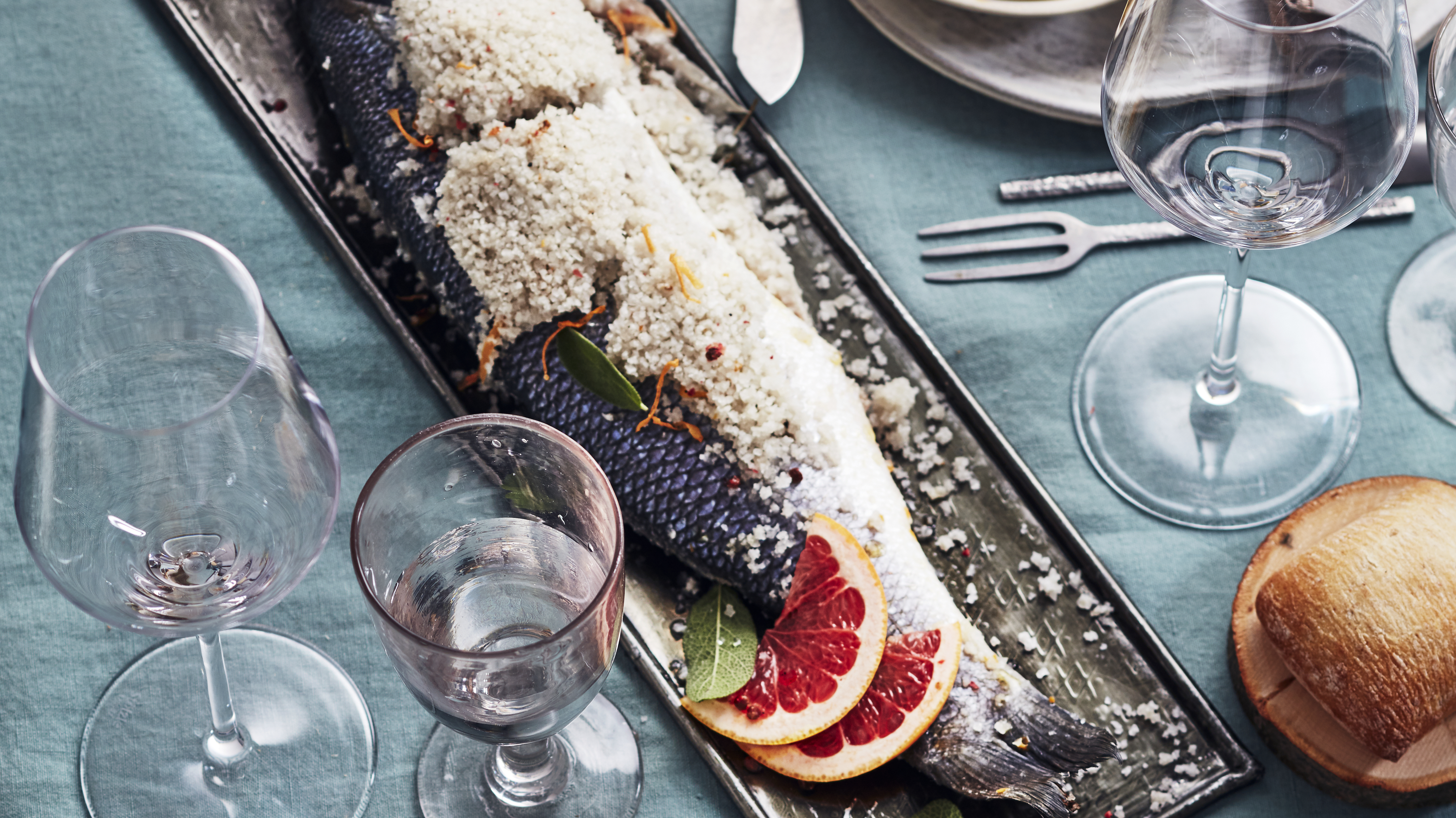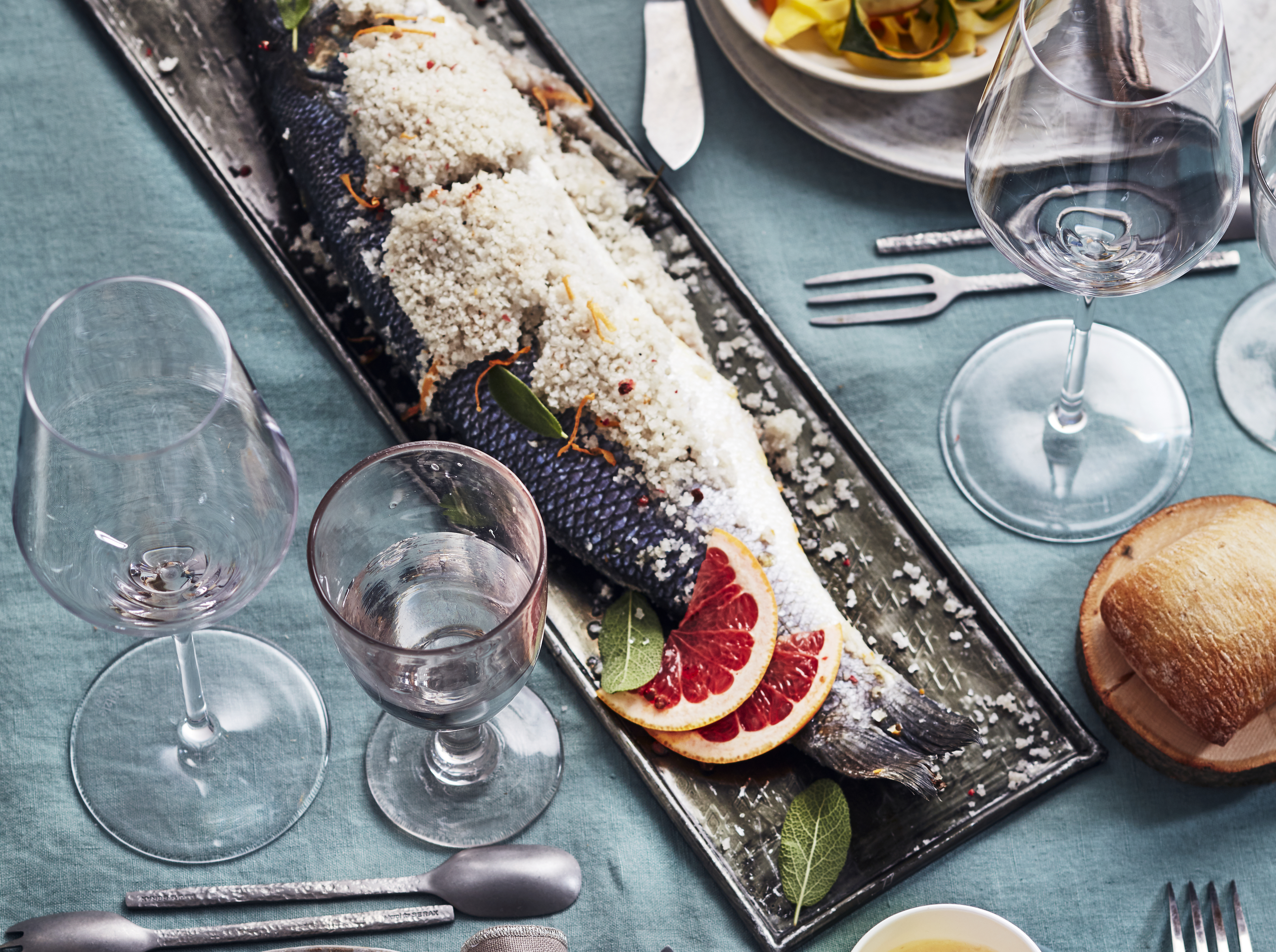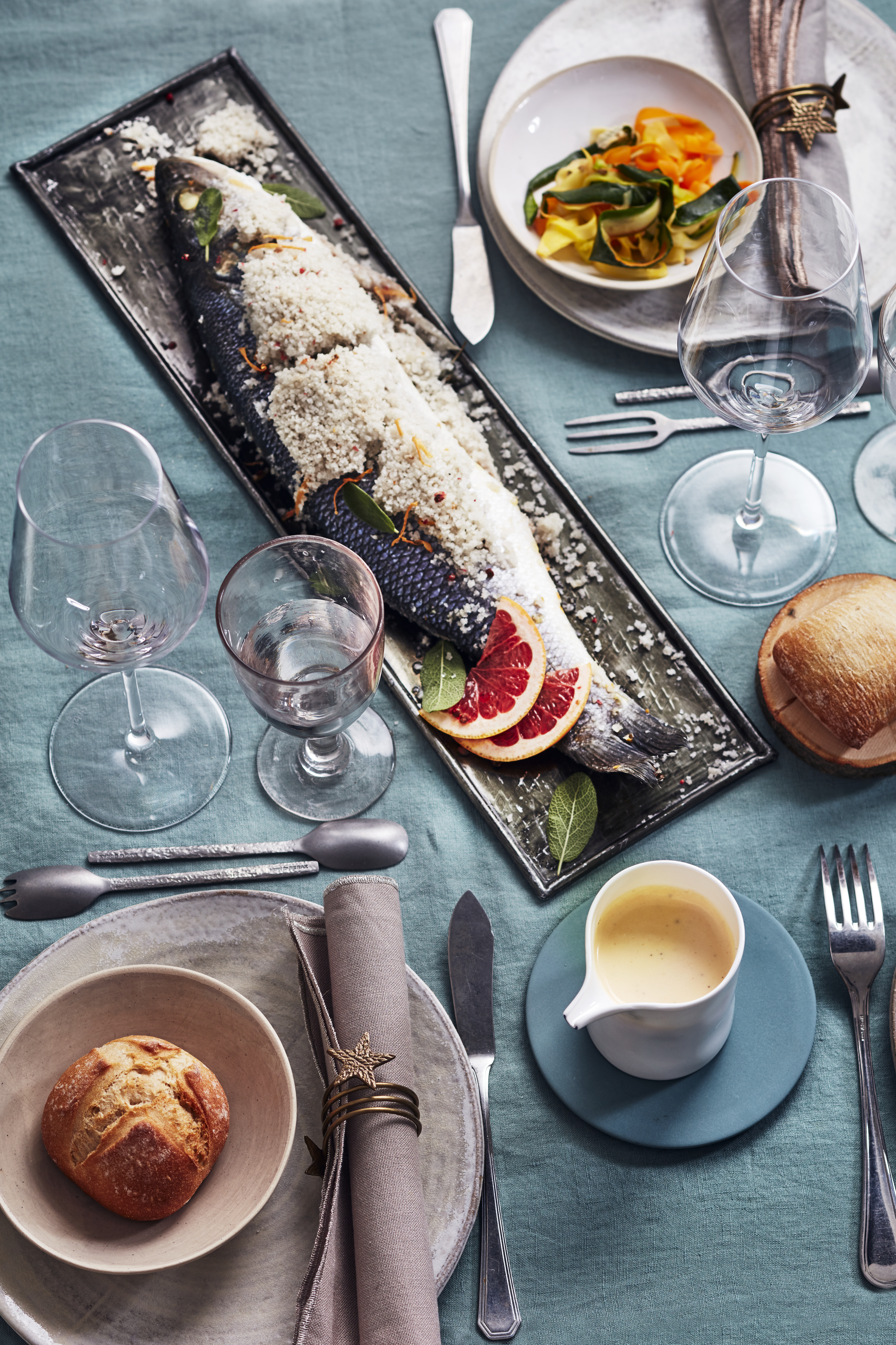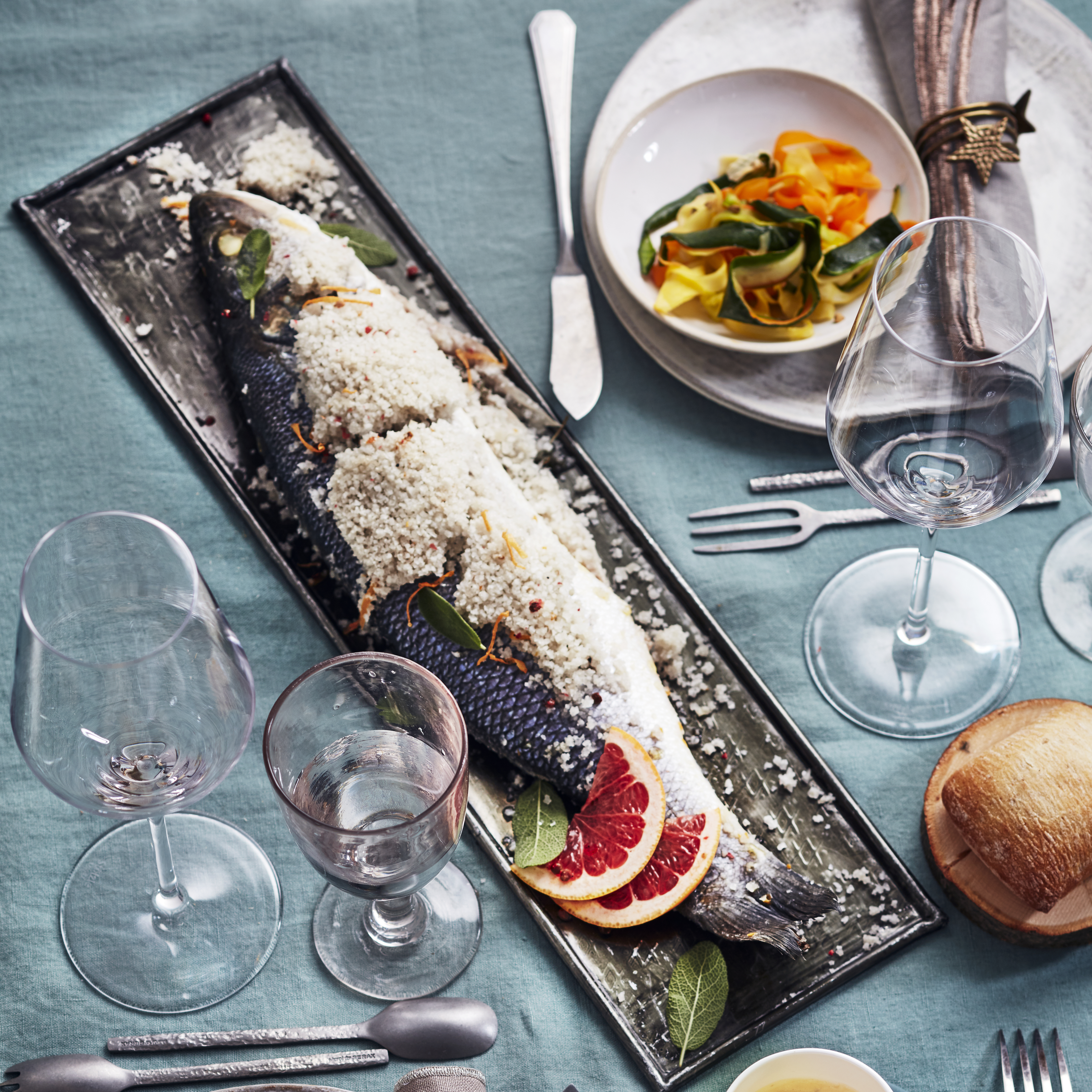 Bar en croûte de sel au pamplemousse, et ses tagliatelles de légumes à la crème