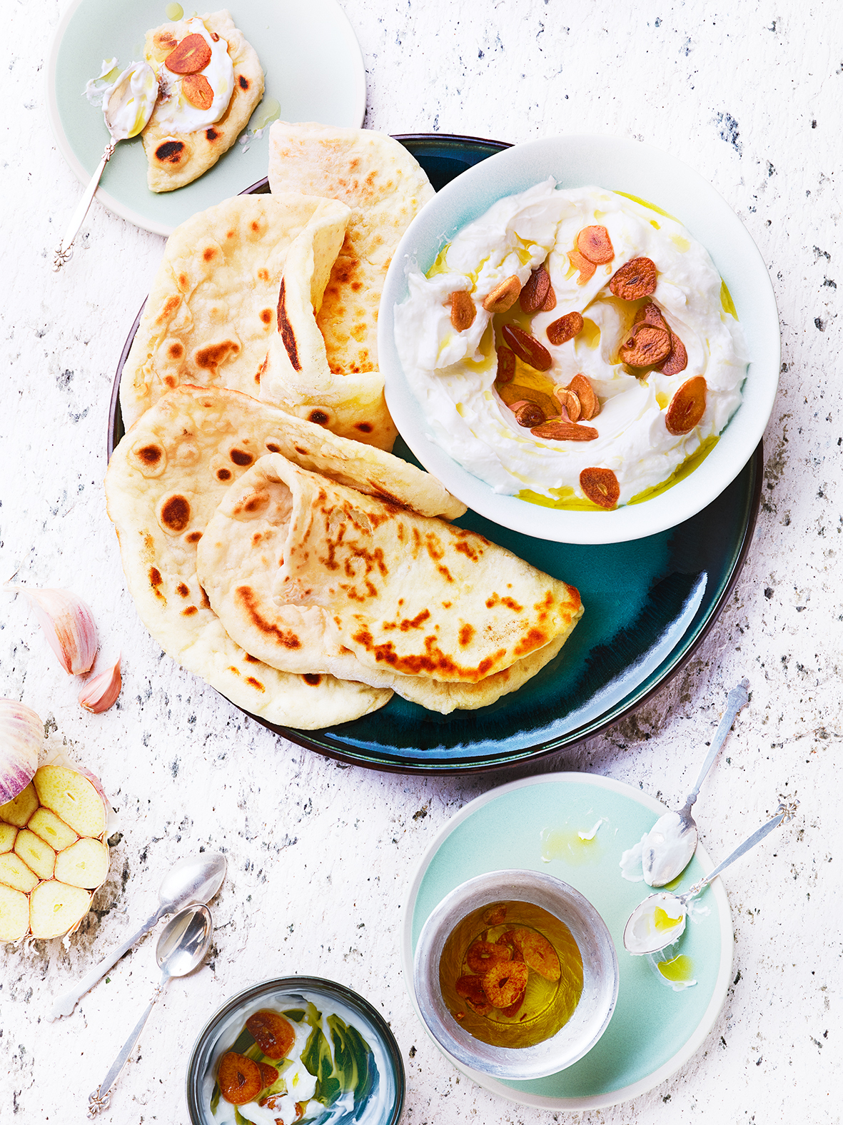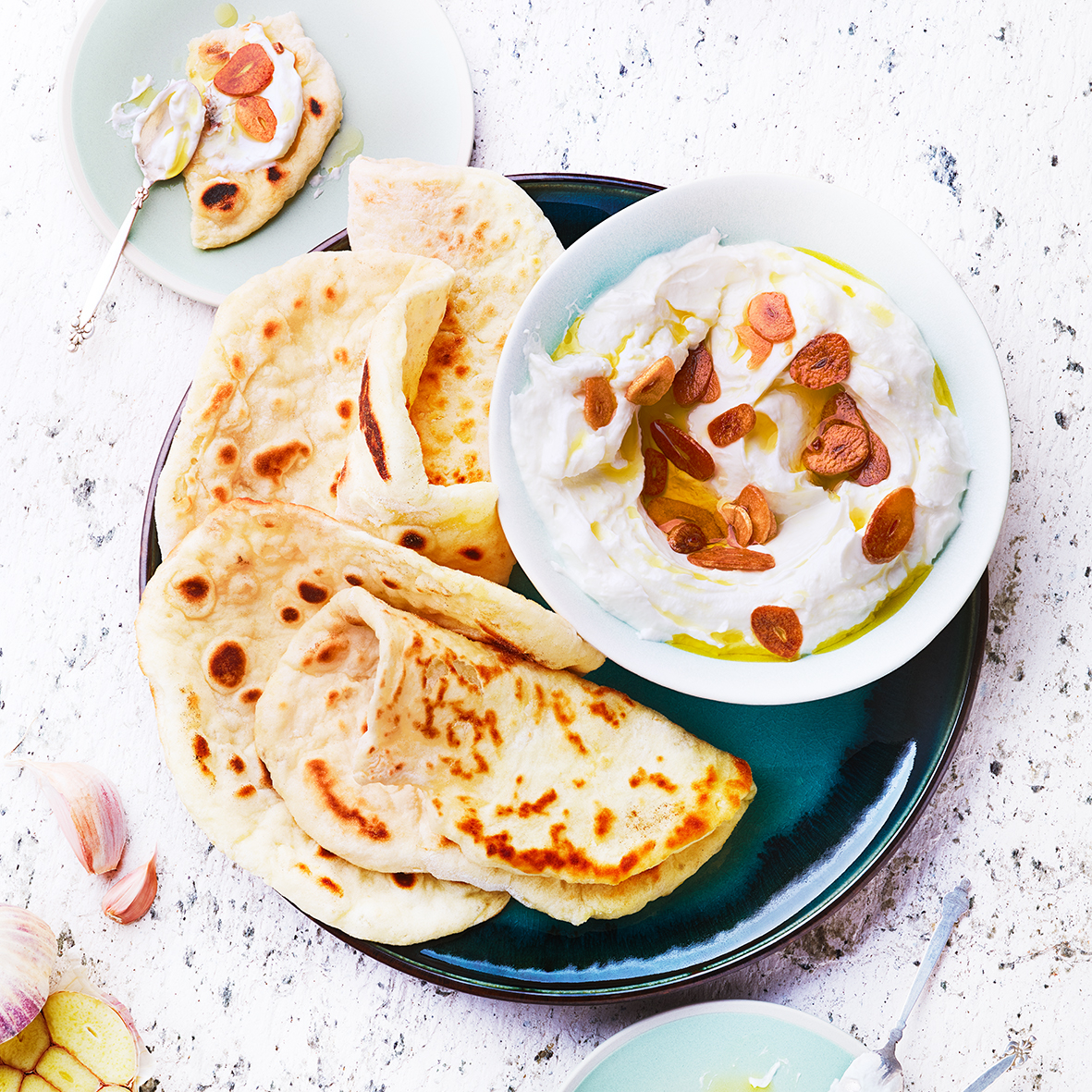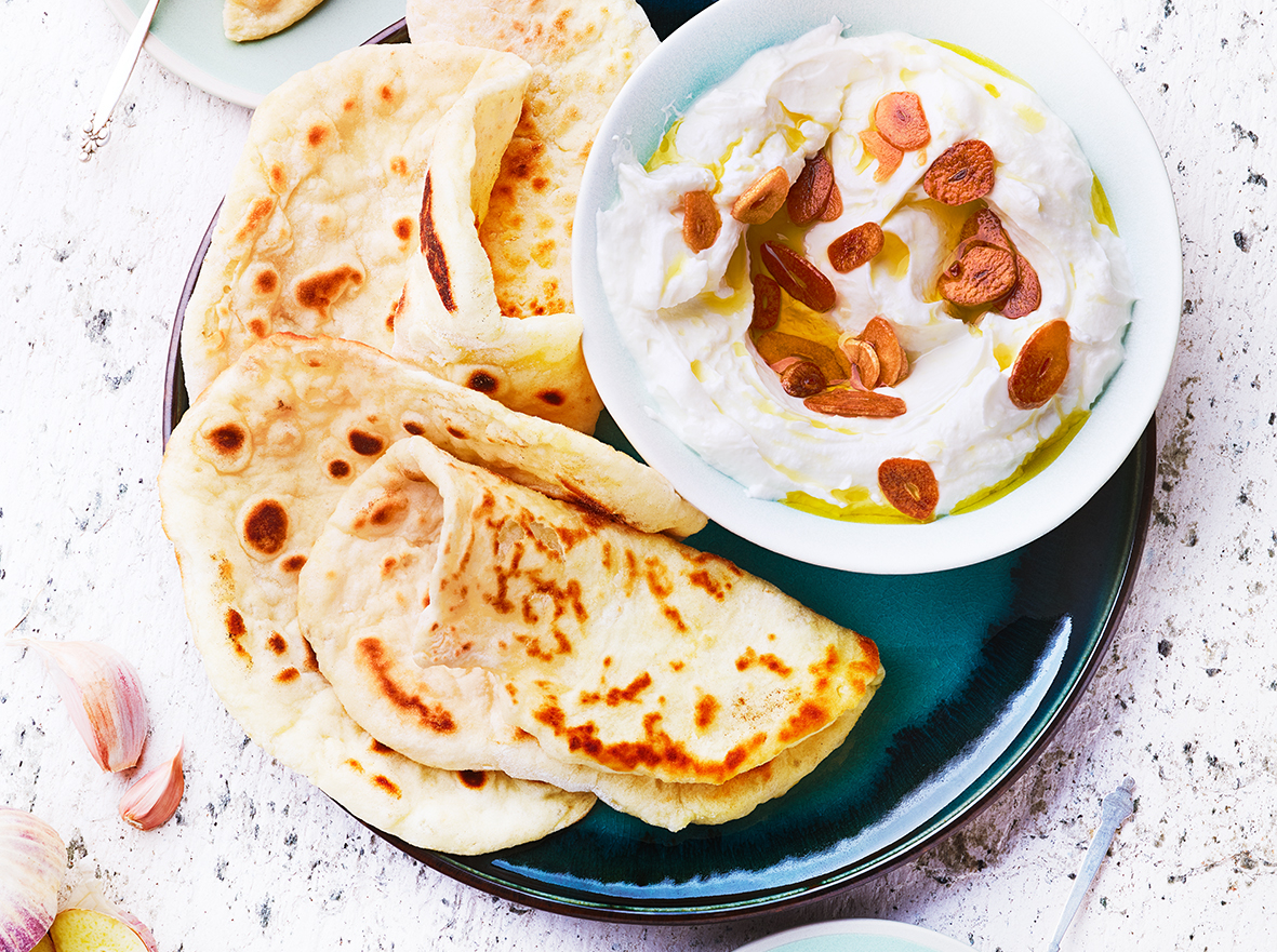 Dip de yaourt à l’ail et pains moelleux