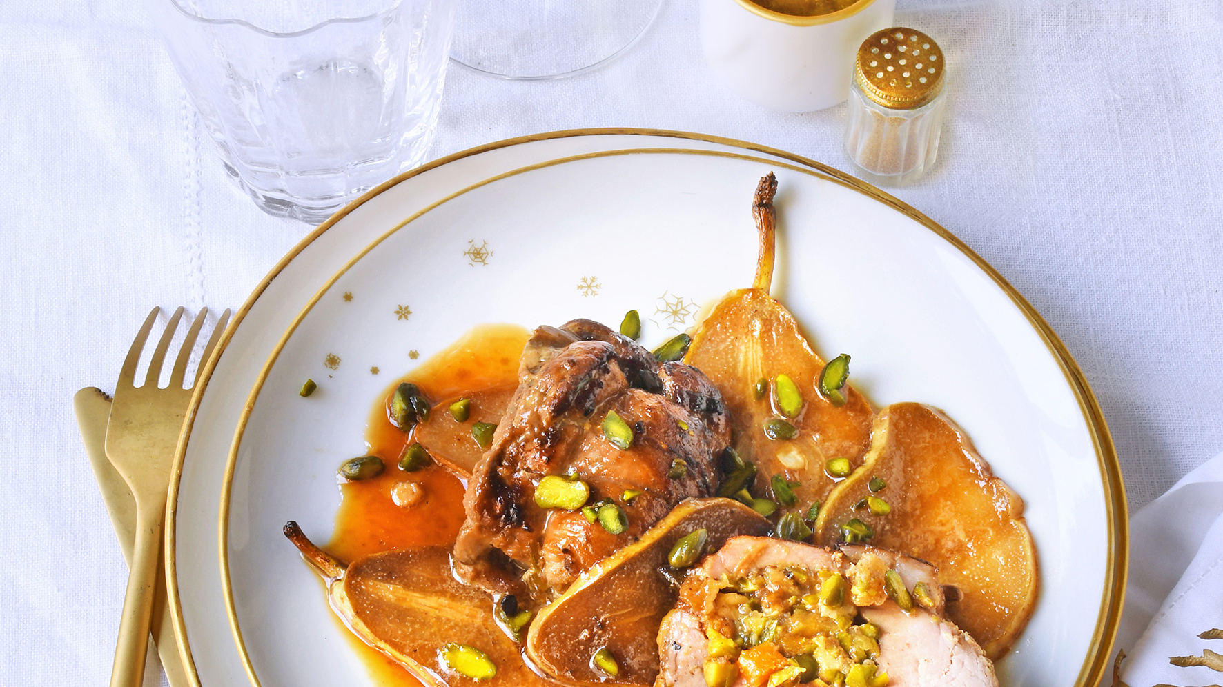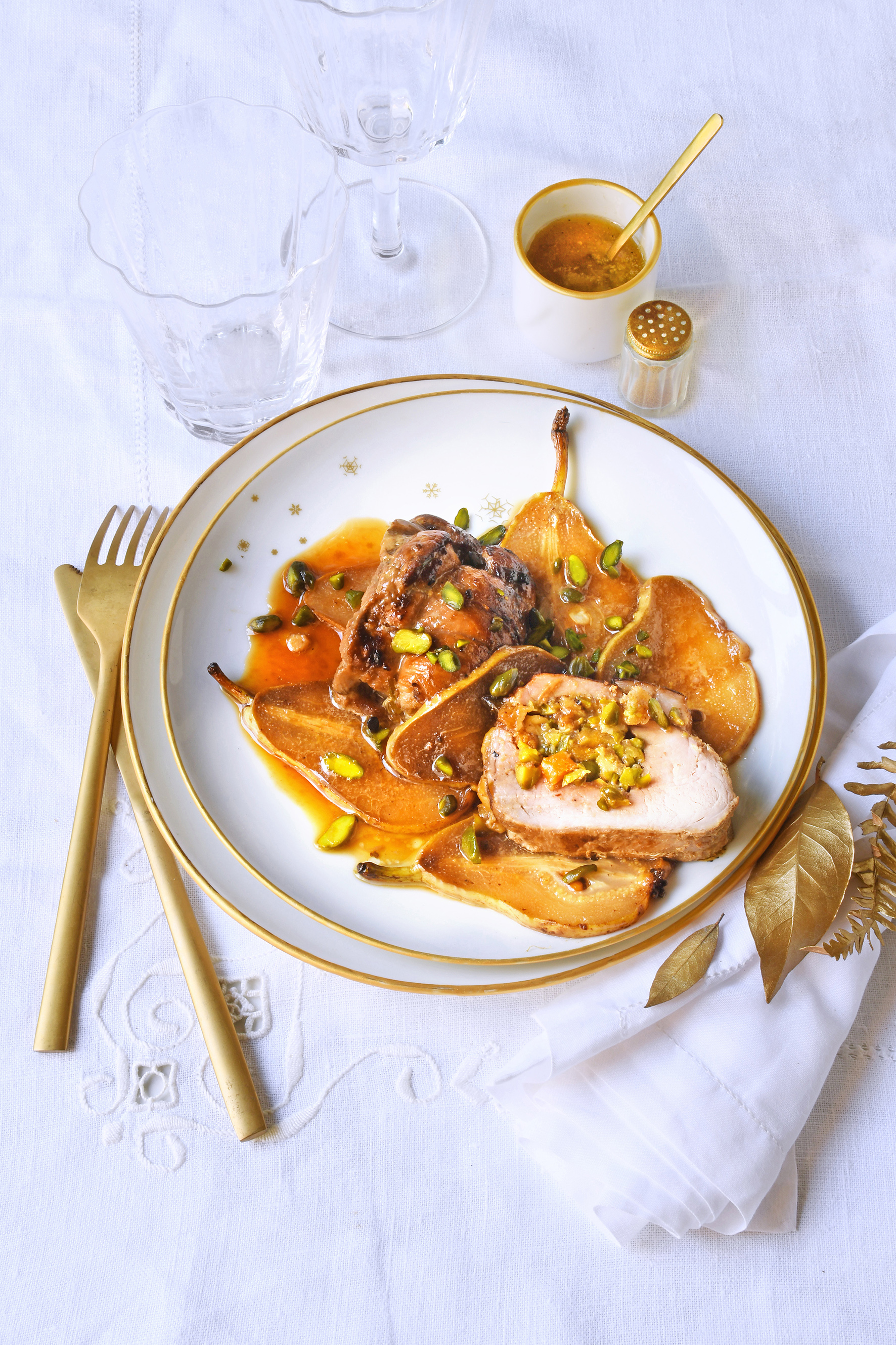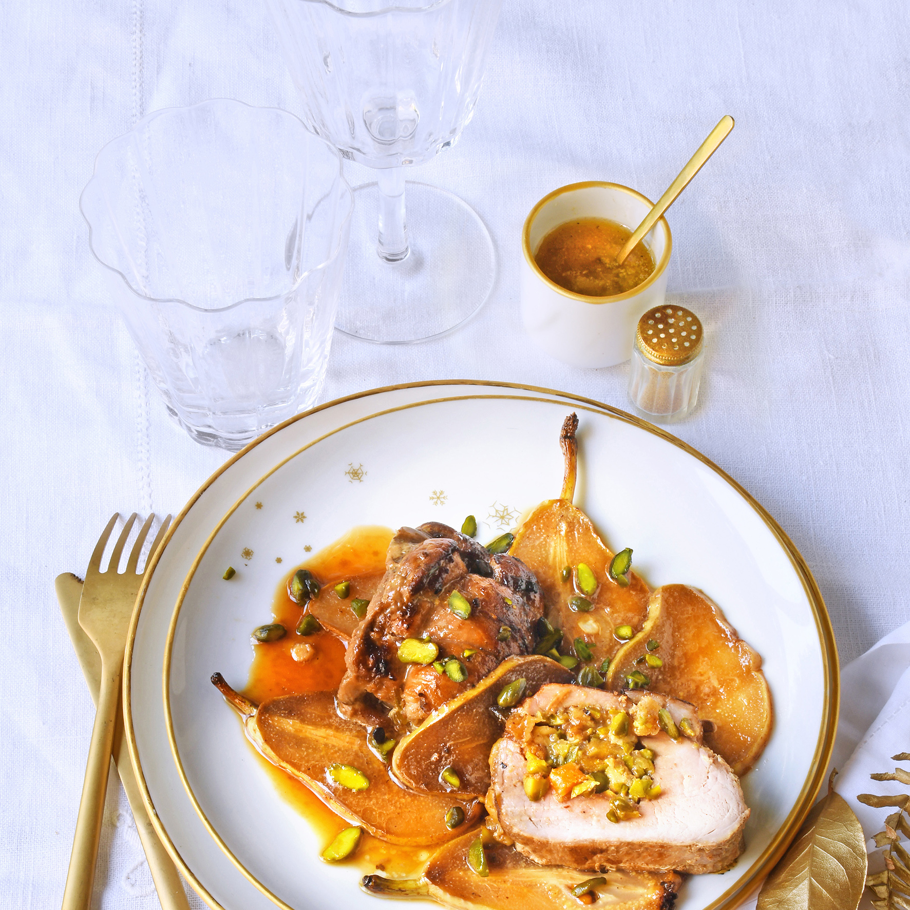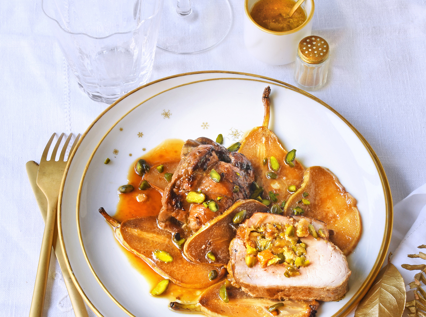 Filet mignon de veau farci au beaufort et pistaches accompagné de poires