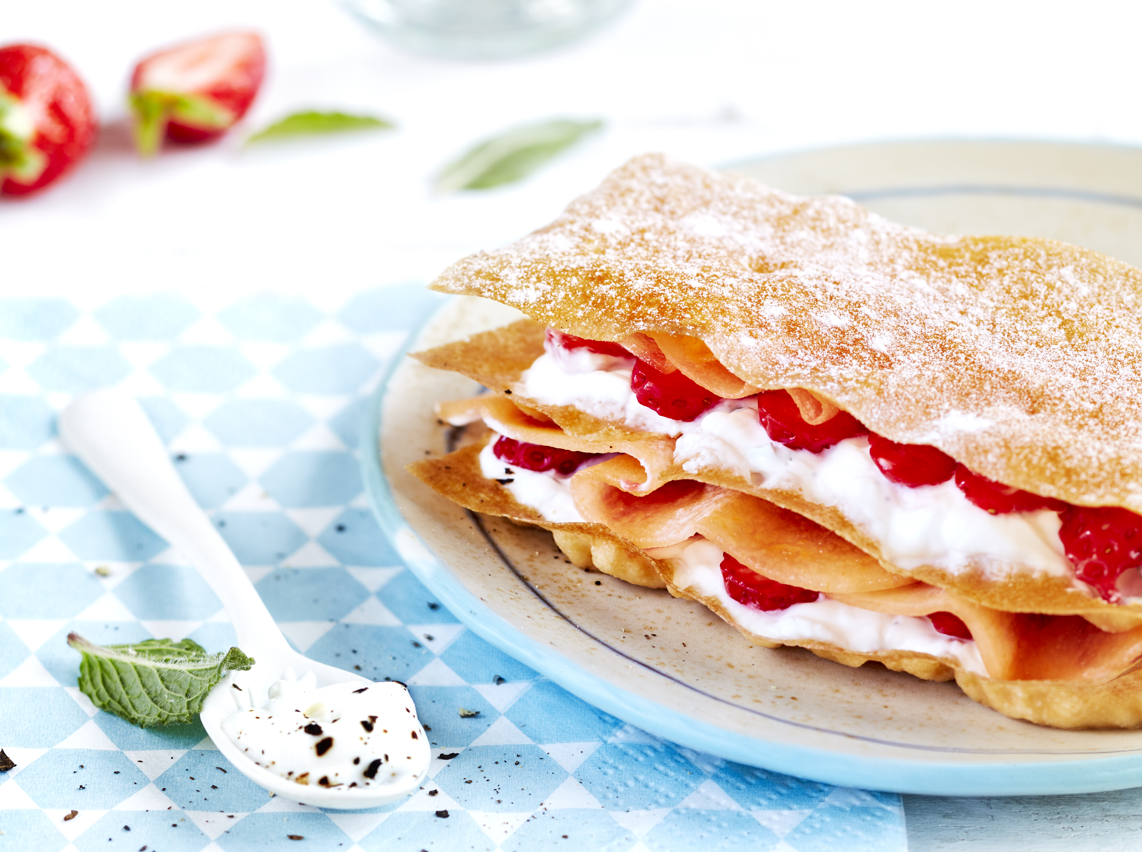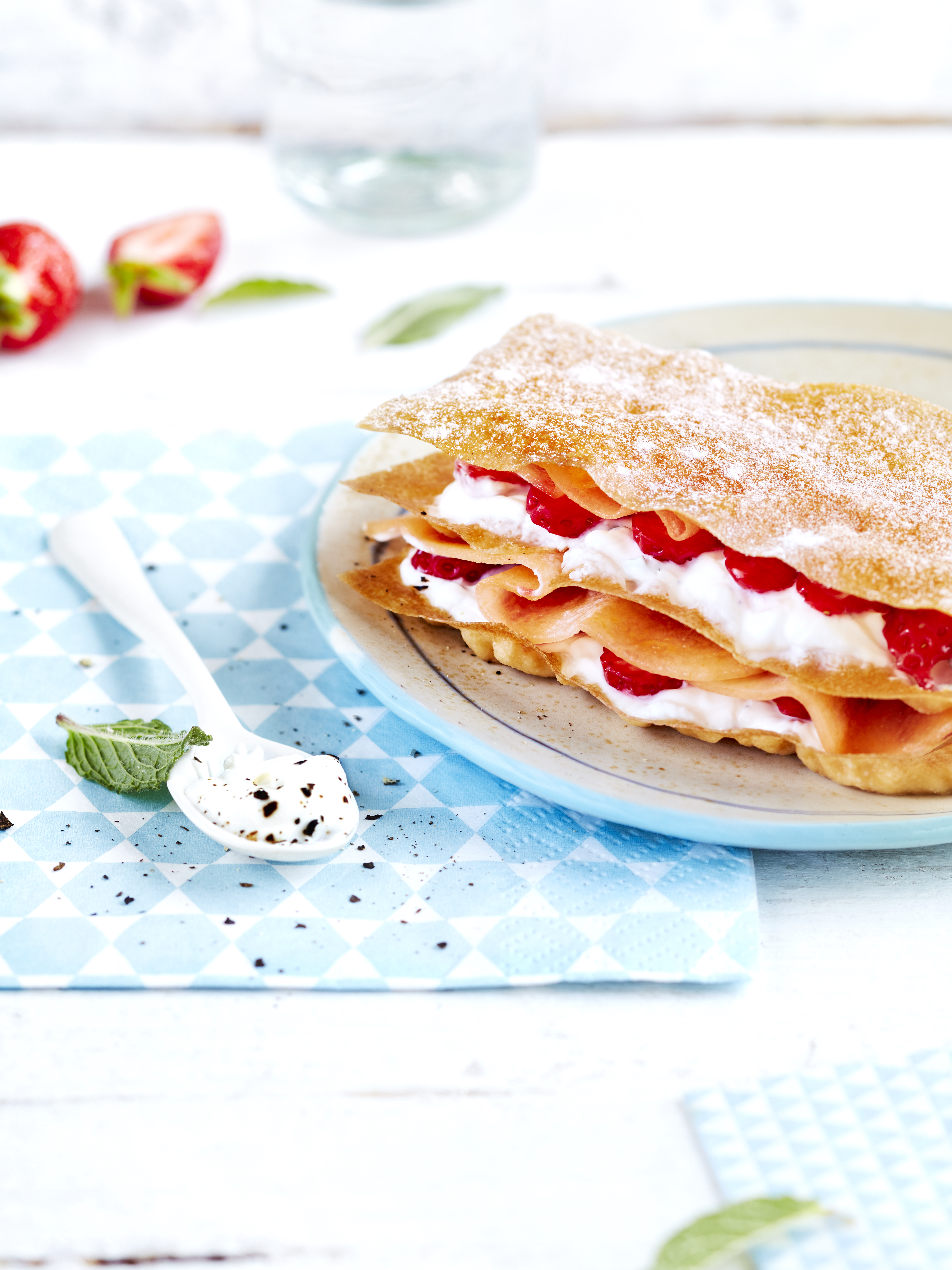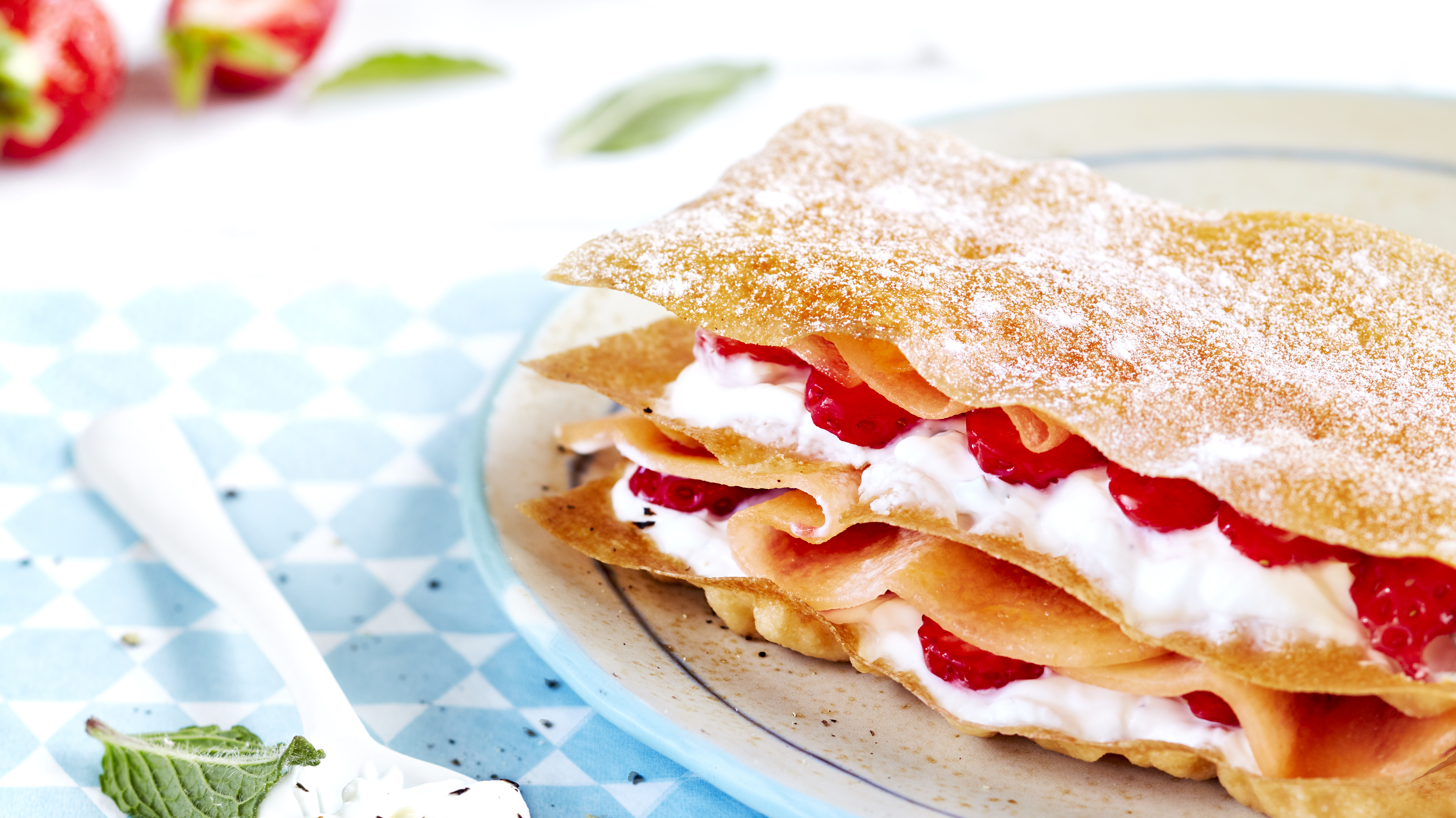 Millefeuille de petit-suisse au melon, fraises et menthe