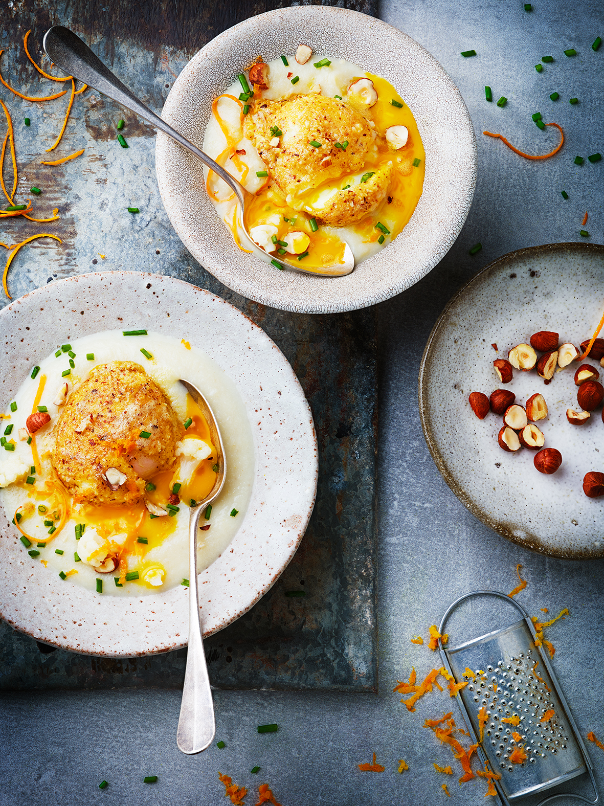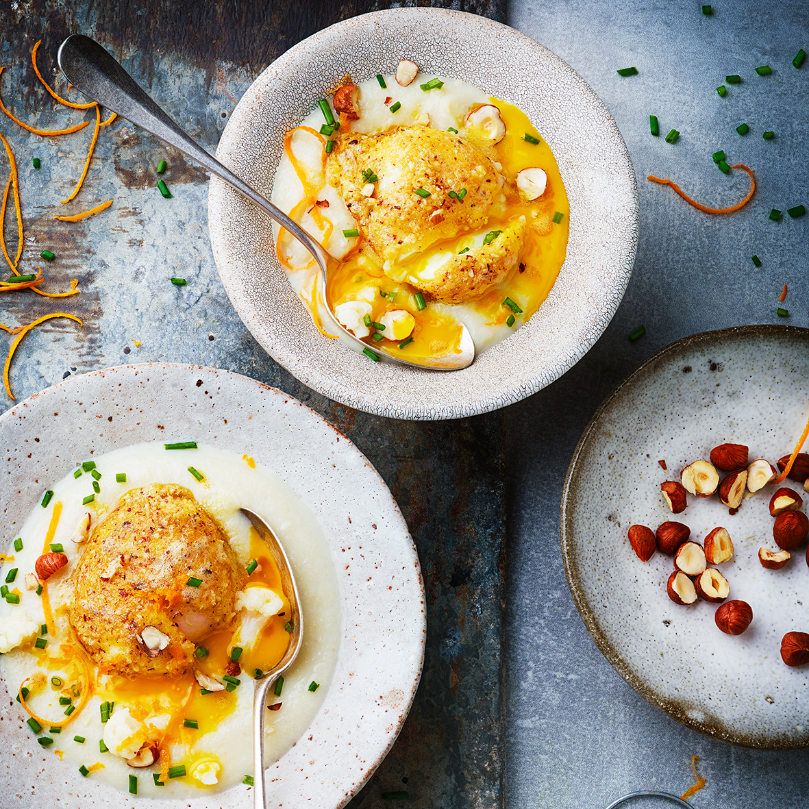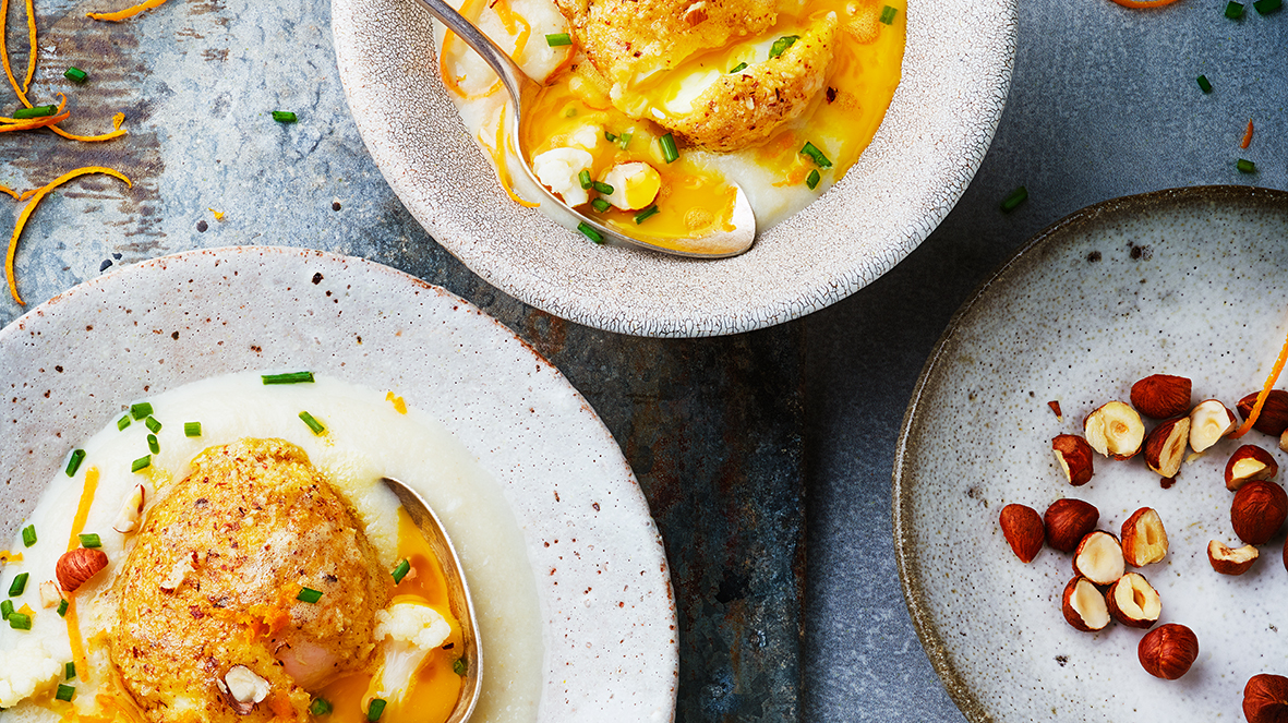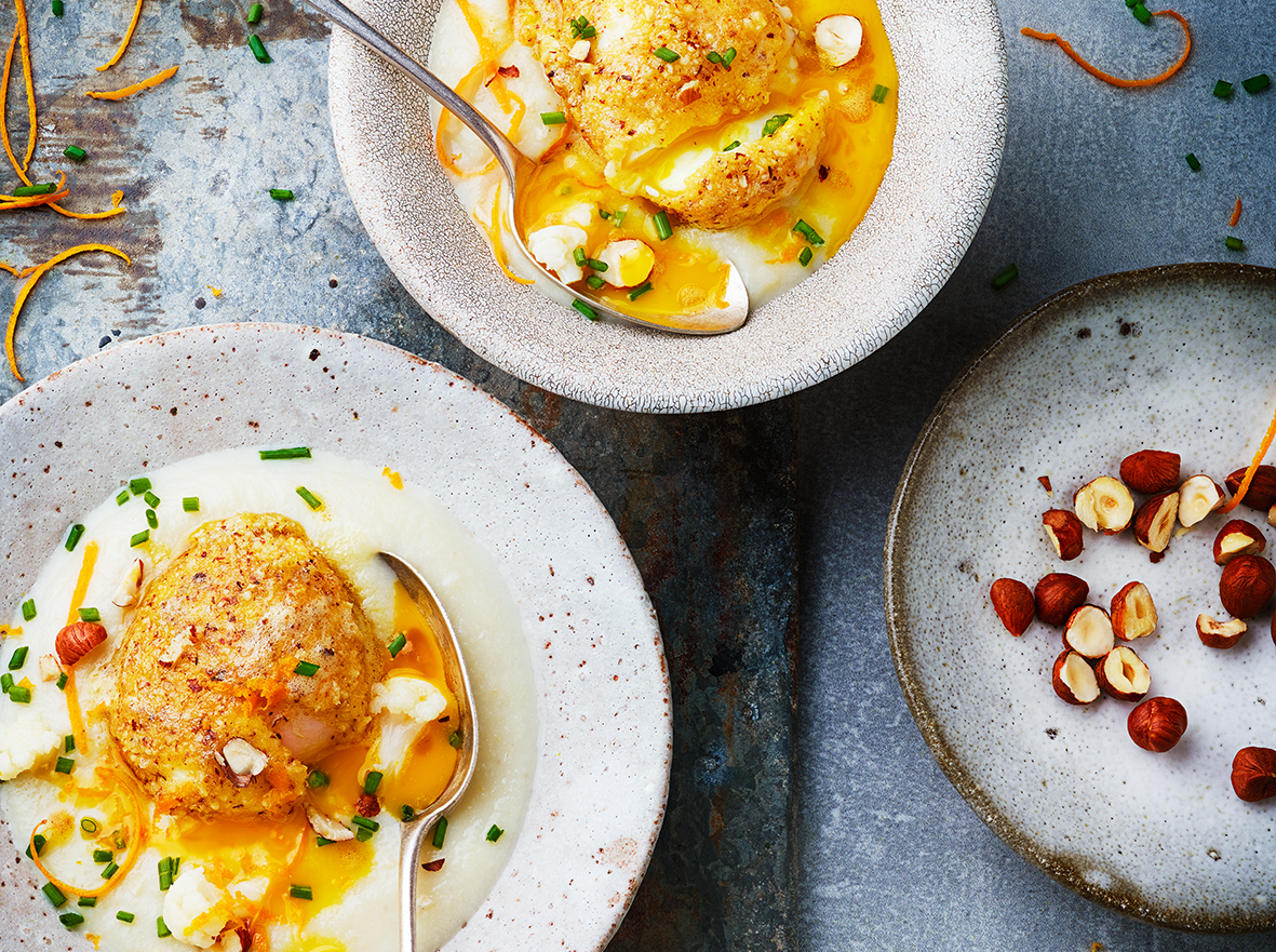 Œufs panés et crème de chou-fleur à la noisette