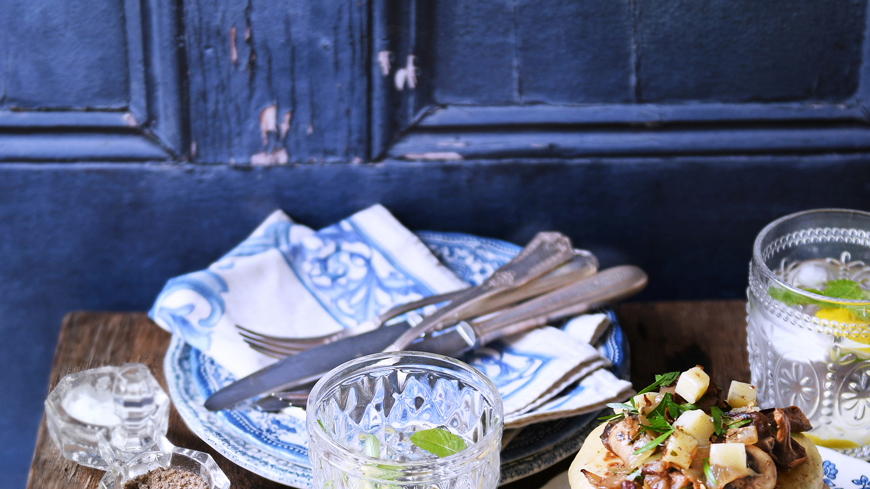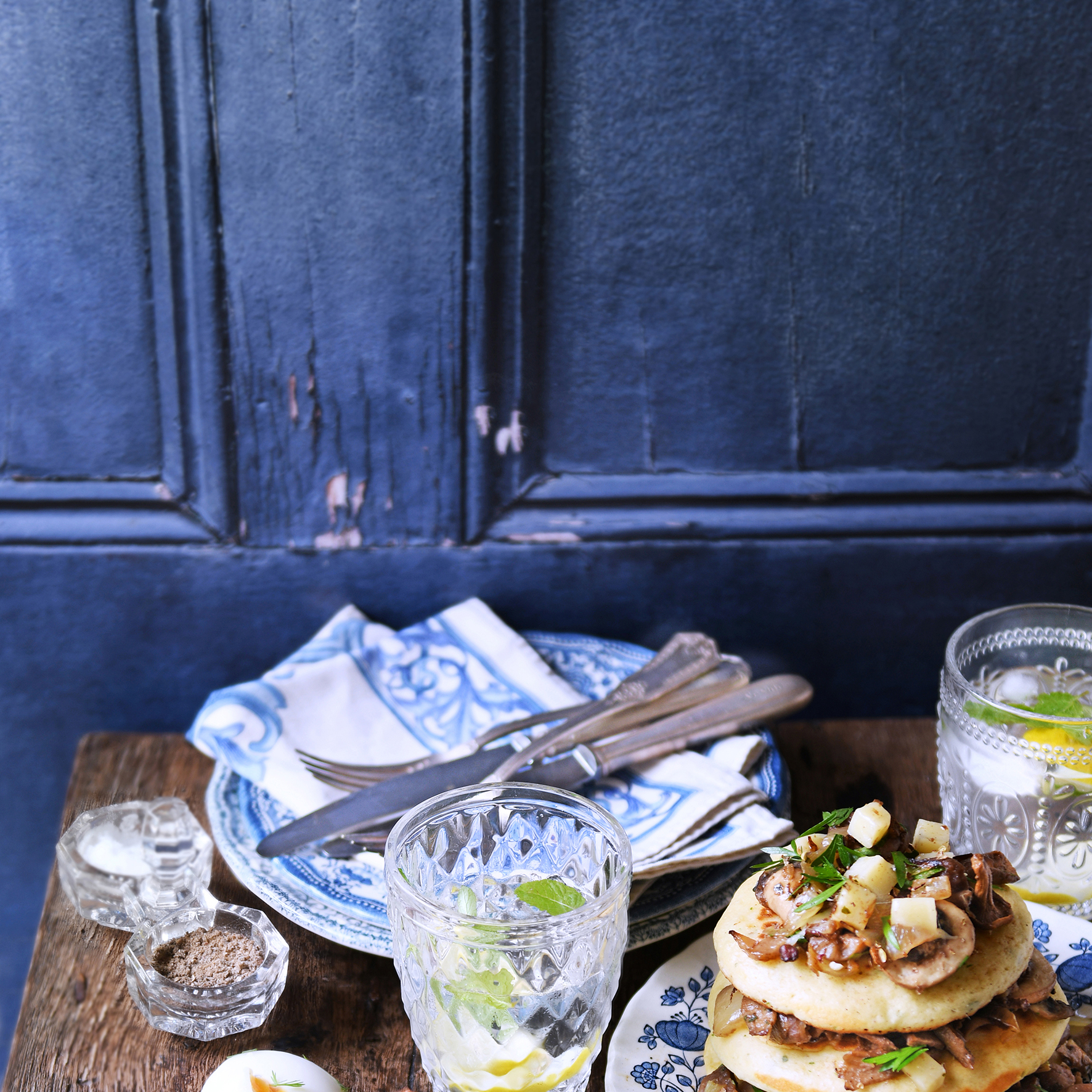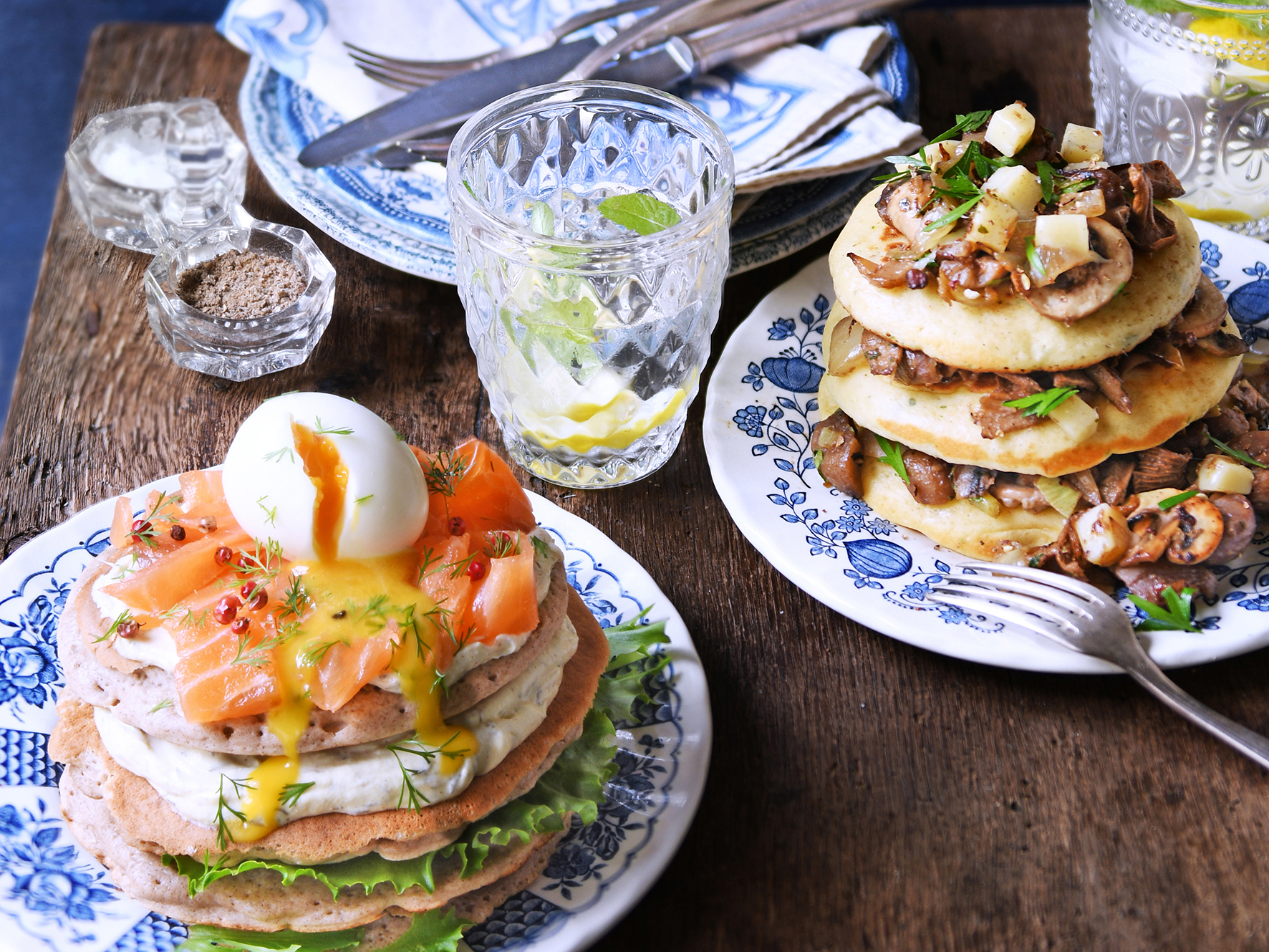 Pancakes au saumon et crème d’aneth et aux champignons-châtaignes et comté