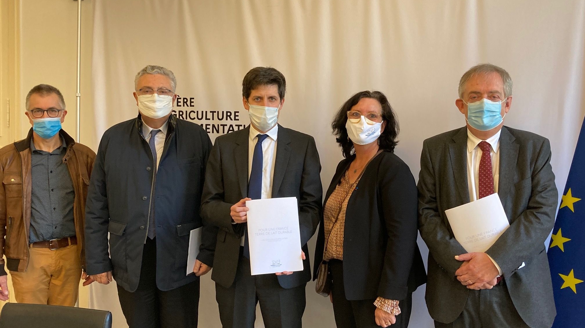 De gauche à droite : Damien Lacombe pour le collège des coopératives laitières, Jacques Creyssel pour le collège du commerce, de la distribution et de la restauration, Julien Denormandie, Ministre de l’Agriculture et de l’Alimentation, Marie-Thérèse Bonneau pour le collège de la production laitière, Robert Brzusczak pour le collège des industriels