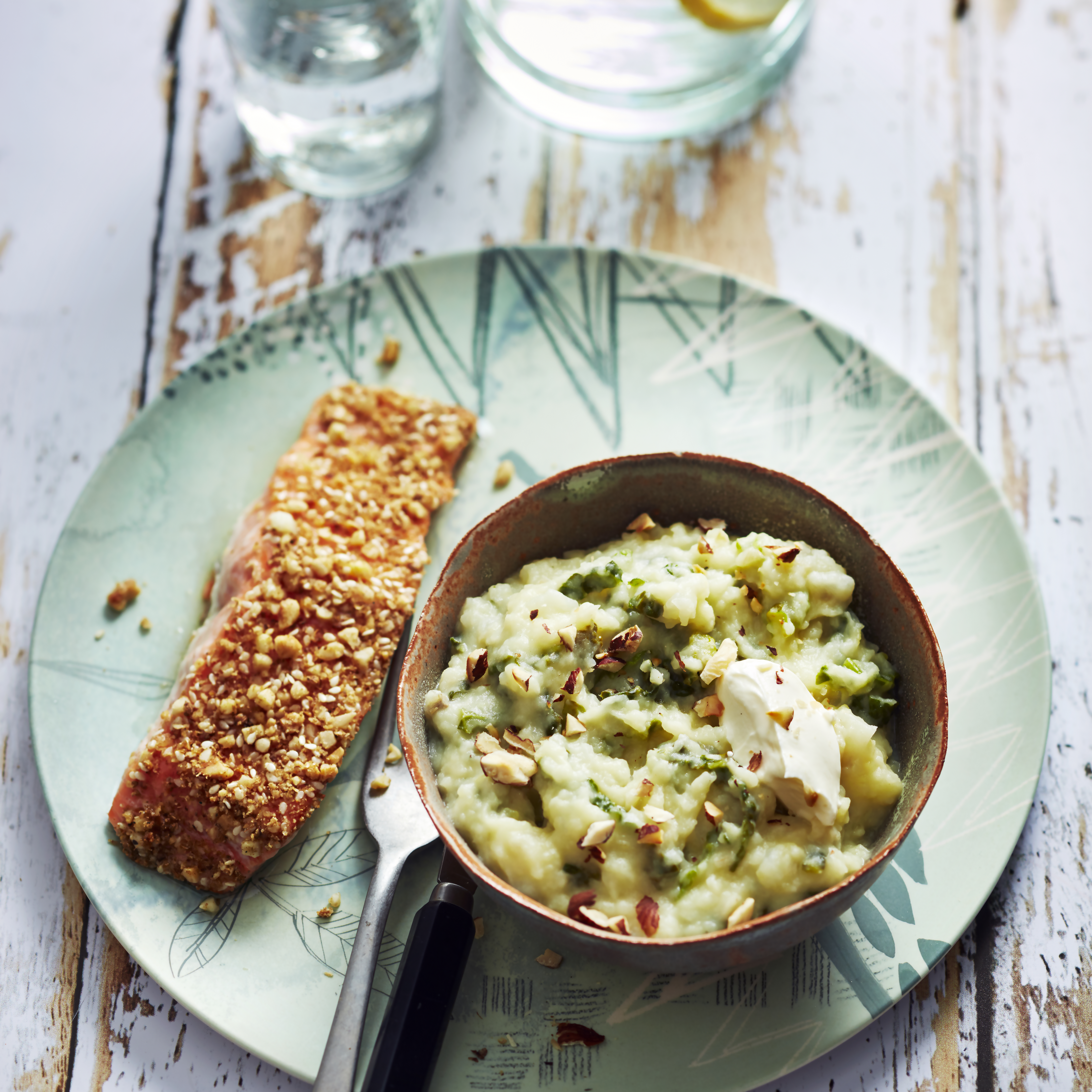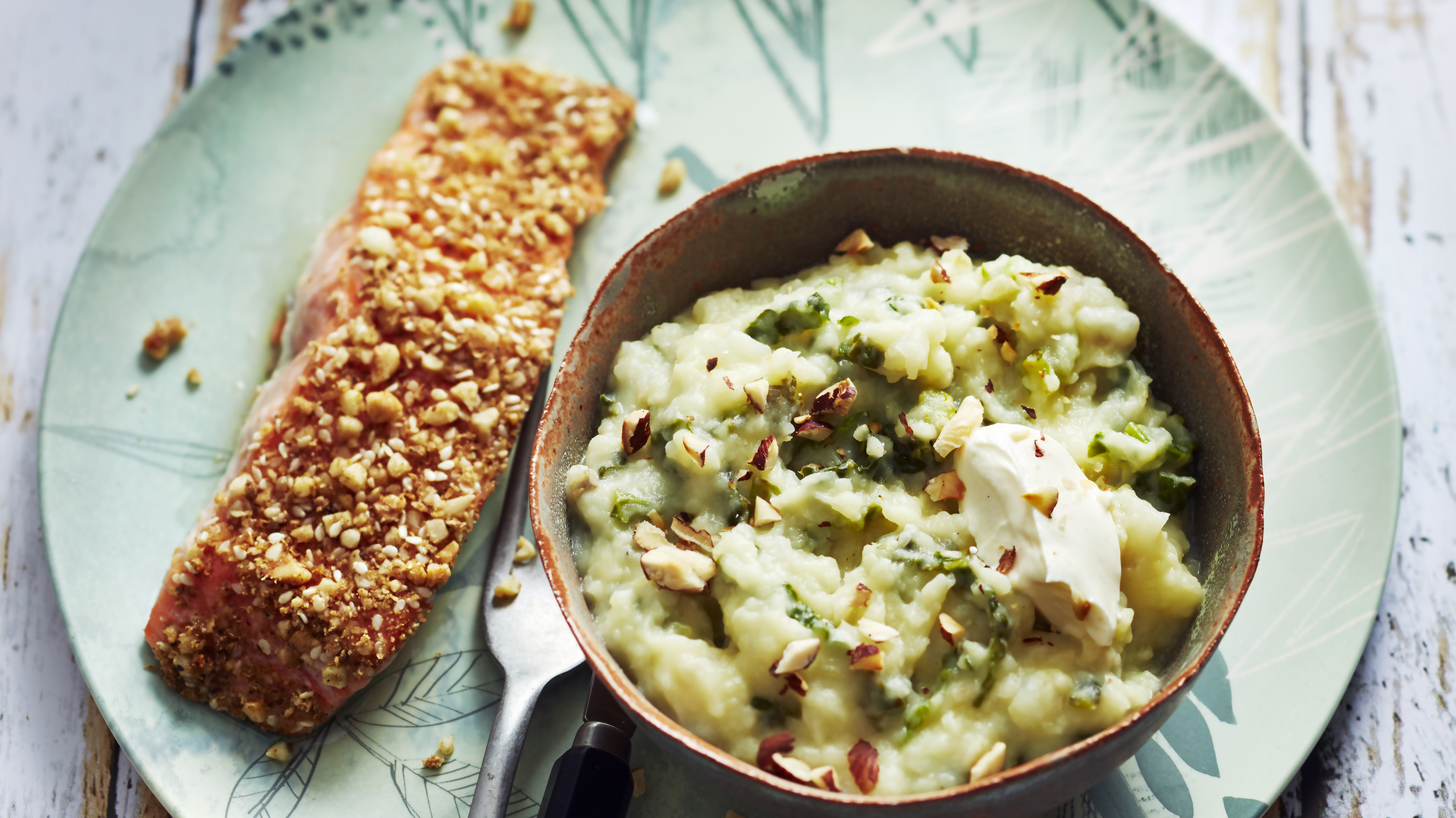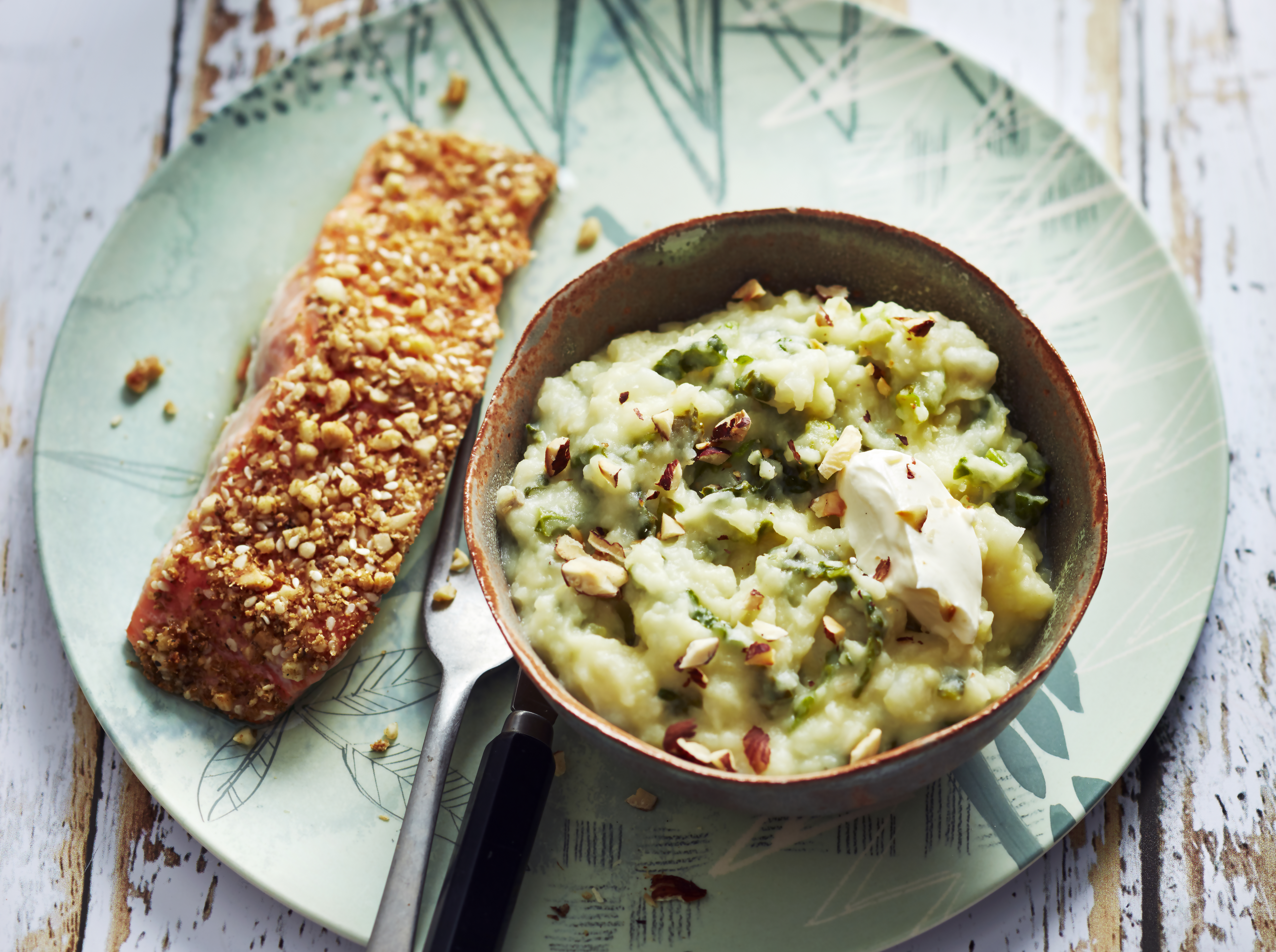 Saumon pané au dukkah et sa purée de légumes racines de printemps